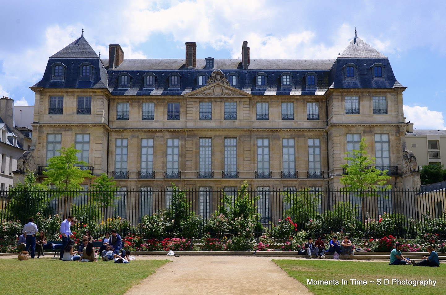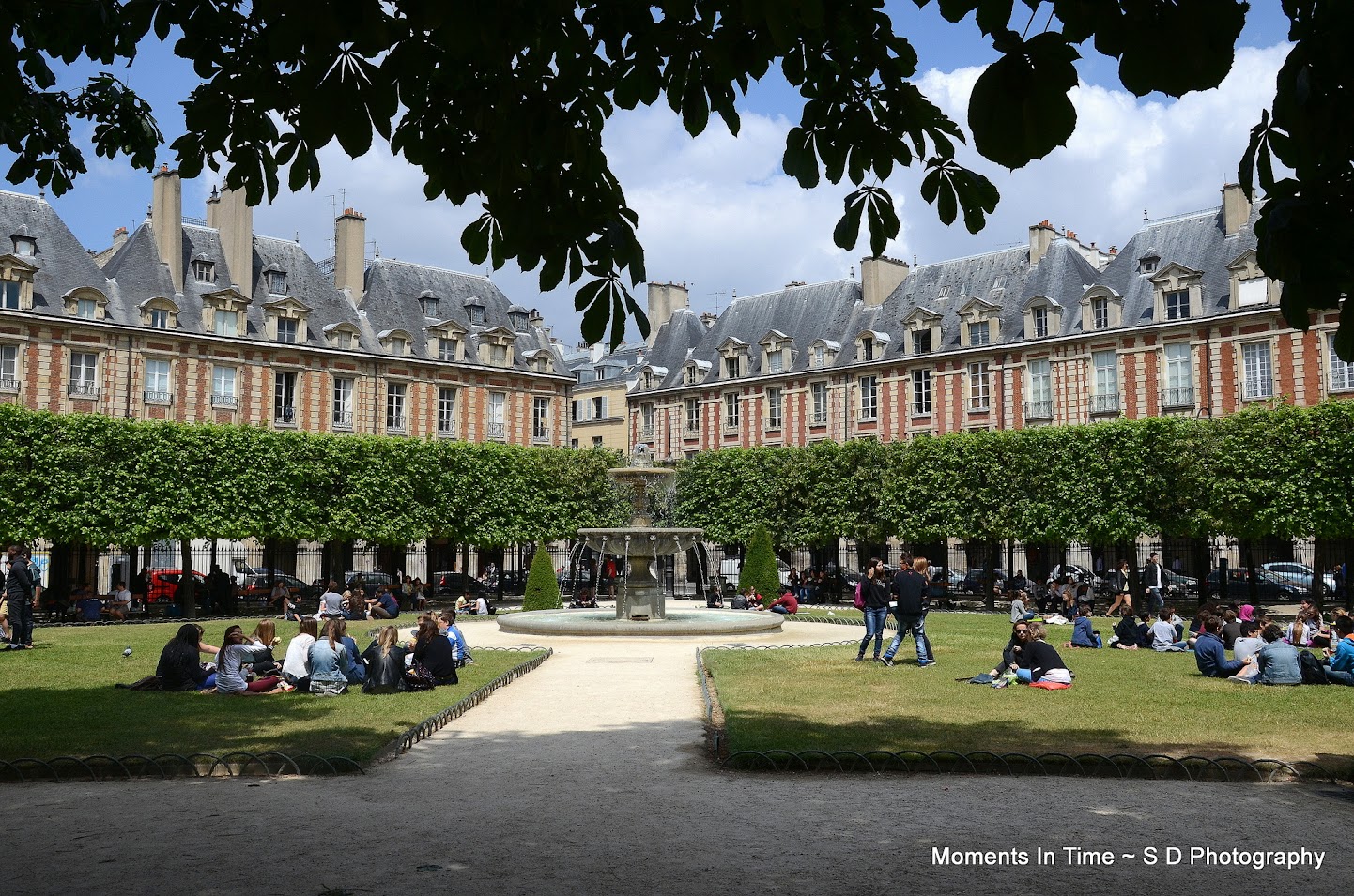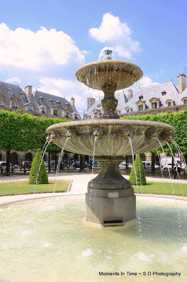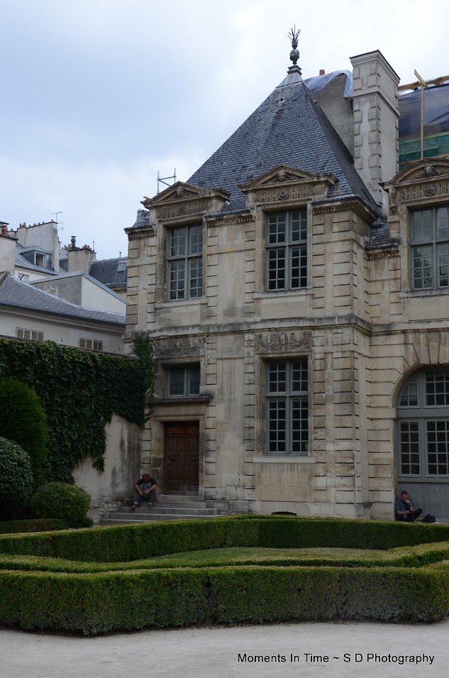We walked through the courtyard and out the other side and here we were....Place des Vosges! 36 mansions all built in a courtyard all looking the same, built by Henry IV! There's a beautiful park in the center courtyard that's very popular for picnics, and when we were there that's exactly what was going on! The grass was covered with picnickers!